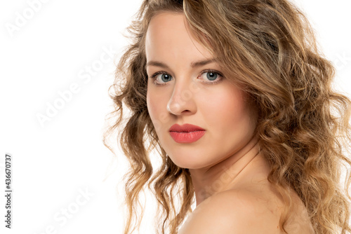 beauty, blond, blond, blue eye, caucasian, cosmetic, curly, elegance, face, fashion, female, hair, coiffure, light, long, make up, make-up, make-up, model, natural, honed, portrait, seductive, serious, shampoo, shirtless, shoulder, styling, volume, wave, white, white background, woman, woman, young