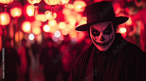 Blood Sucking Ghost Festival, night parade with people wearing scary vampire costumes, dim red lights illuminate the dark streets, Ai generated images