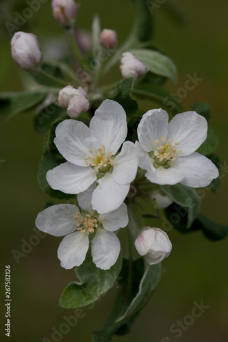 Blooming Apple branch on a blurred background of dark greenish shades. Open flowers and buds. Natural light.