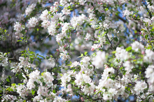 Blooming apple tree branches in spring. Flowering apple tree. White and pink color. Selective focus.