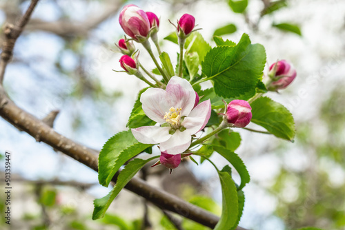 Blooming apple tree in the garden. Spring seasonal of growing plants. Gardening concept