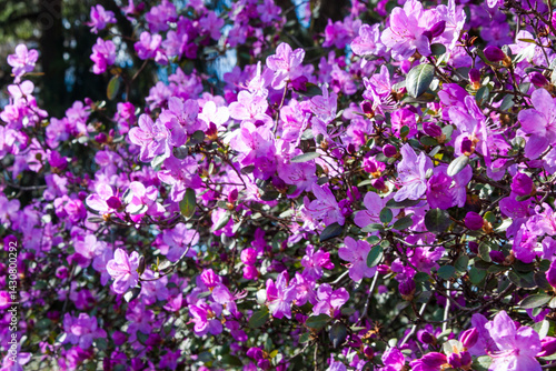 Blooming Azalea Flowering Plants Closeup Photo. Blossoming Decorative magenta Buds Flowers And Green Leaves Branches. Colorful purple rhododendron flowers large bush in sunny day.