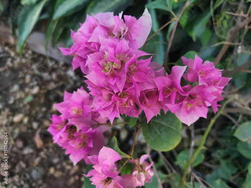 Blooming bougainvillea flowers. Bright pink magenta bougainvillea flowers as a floral background. Blurry Background