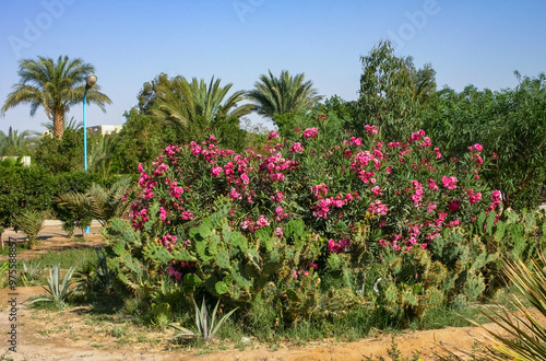 Blooming cacti and various tropical plants in the interior of a hotel garden in Hurghada