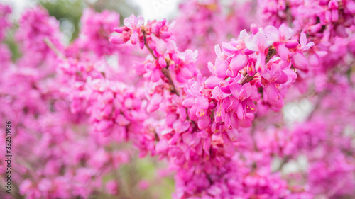Blooming Cercis chinensis or the Chinese redbud. Natural spring background with sun shining through pink beautiful flowers.