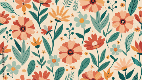 floral, flower, pattern, seamless, design, background, texture, textile, wallpaper, print, illustration, botanical, nature, spring, summer, blossom, bloom, vintage, retro, aesthetic, pastel, orange, pink, red, green, beige, cream, leaf, plant, pretty, cute, romantic, feminine, delicate, whimsical, joyful, happy