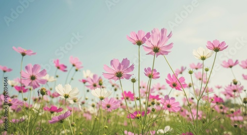 Blooming Flower Field with Pink and White Flowers Against Blue Sky