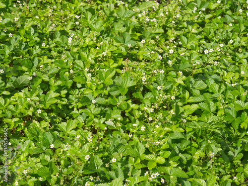 Blooming fragaria (wild strawberries) green meadow. Growing strawberries creating a carpet of lush green leaves Fragaria covering the ground. Green aesthetic. Vibrant green background. Green texture