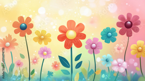 flower, garden, whimsical, colourful, vibrant, joy, energy, cheerful, field, dream, flower petals, shimmering, sunlight, happy, cute, spring, illustration, design, graphic, background, nature, botanical, blossoming, bloom, growth, positive, uplifting, optimistic, sweet, delicate, gentle, serene, peaceful, calmness