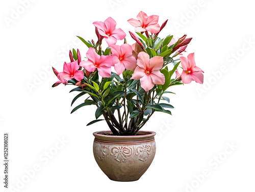 Blooming pink flowers in decorative pot indoor garden photographic still life bright light