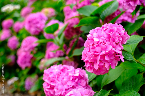 Blooming pink hortensia flowers in garden