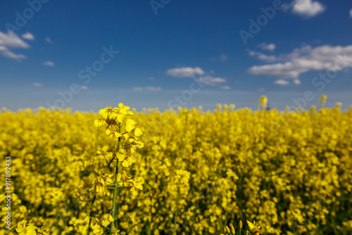 Blooming rapeseed (Brassica napus).Yellow field and blue sky with clouds.Agricultural field with rapeseed plants. Oilseed, canola, colza.Blooming yellow canola flower meadows.