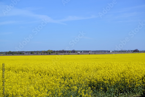 field, rapeseed, colza, canola, flowering, flower, family, cabbage, agriculture, cultivation, plant, cultivated, oilseed, flora, yellow, bright, colours, rural, landscape, spring, sunny, day, sky, blue, deserted, nobody, brassica
