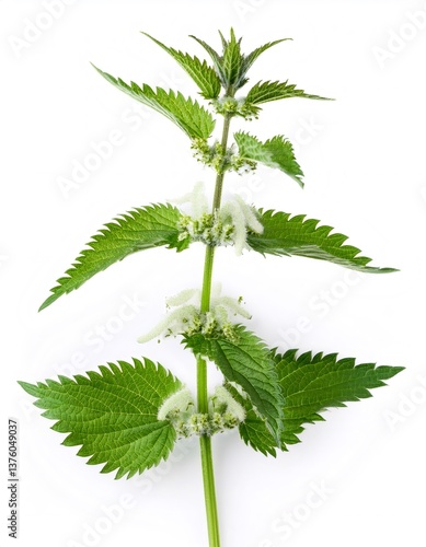 Blooming stinging nettle with bright green leaves and white flowers, isolated on a white background, showcasing the beauty and detail of this common yet often overlooked plant