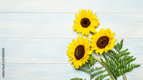 beauty, blooming, blossom, blue background, botanical, botany, bouquet, bright, bunch, colours, colourful, copy space, countryside, decoration, decorative, flora, floral, flower, fresh, from above, gardening, green, leaf, nature, oil, open, painted, plank, plant, pollen, rural, season, summer, sunflower, table, wooden, yellow