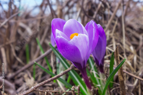 Blooming violet crocus in early april