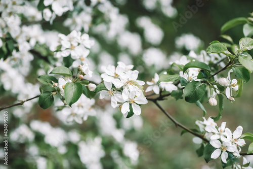 Blossom apple tree spring background. Blooming tree in spring against the background of a sunny spring sky.