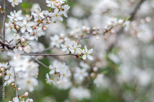 Blossoming cherry tree, a branch close-up with blooming white flowers and young green leaves on a background of blurred white flowers