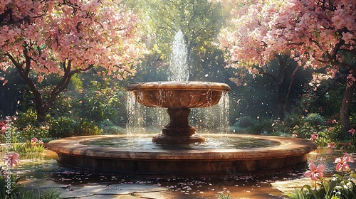 blossom, spring, fountain, historic, peaceful, water, garden, flower, nature, sunlight, serene, beauty, bloom, relaxation, landscape, scenery, vibrant, tranquil, elegance, flower petals, soft, atmosphere, calmness, springtime, colours, fresh, idylli, magical