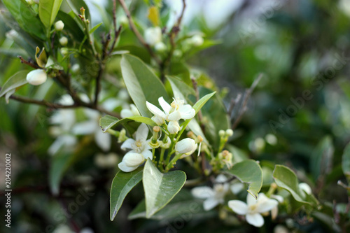 Blossoming mandarin, orange tree. Branch with leaves, flowers closeup photography