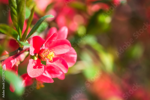 Blossoming red flower background, natural wallpaper. Flowering chaenomeles branch in spring, macro image with copyspace and beautiful bokeh