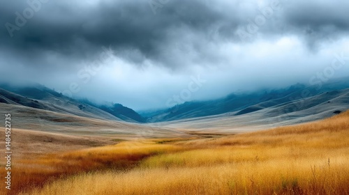 Blowing in the wind with sunrise over foggy meadow hill concept. Dramatic landscape featuring golden fields under a cloudy sky.