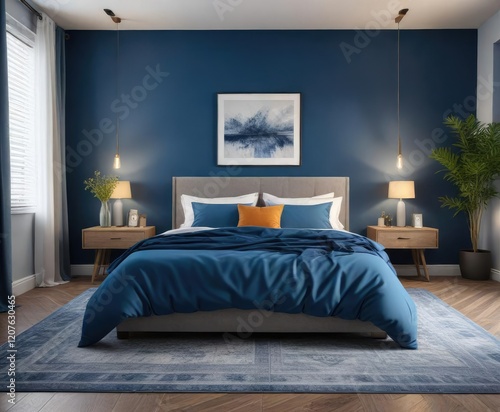 Blue accent wall in a bedroom with a plush area rug and comfortable bedding, calming ambiance , color accents, blue accent wall