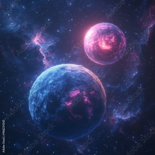 Blue and Pink Planet with Two Suns in Deep Space