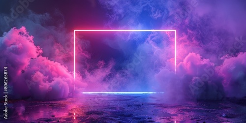 Blue and Purple Neon Light with Cloud Formation. Square shaped Fluorescent Frame in Dark Environment.