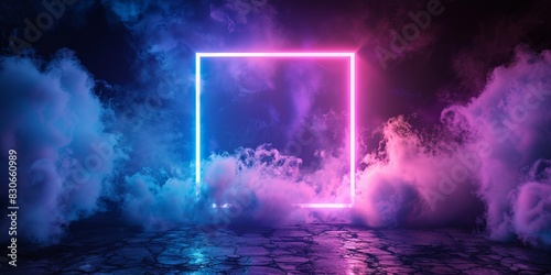 Blue and Purple Neon Light with Cloud Formation. Square shaped Fluorescent Frame in Dark Environment.