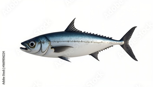 fish, marine life, seafood, ocean, swimming, fin, scale, blue, silver, white background, studio shot, realistic, detailed