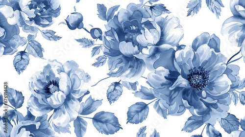 Blue and white floral pattern with roses, peonies, anemones and leaves on vintage background. Vintage style wallpaper for wall or textile design.