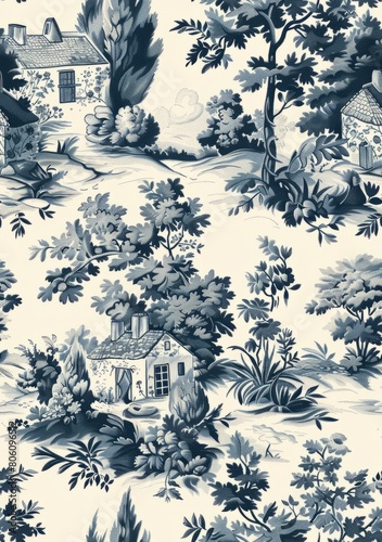 bungalow, farmhouse, tree, plant, nature, landscape, textile, fabric, wallpaper, pattern, design, home decor, interior design, vintage, retro, classic, traditional, french, countryside, provincial, rural, simple