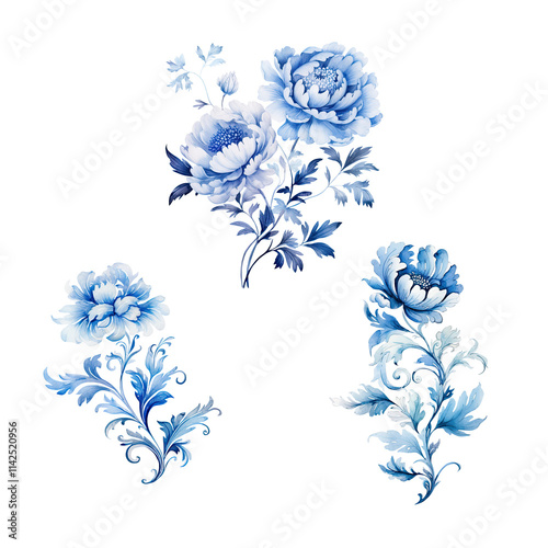 Blue and white Watercolor Flower Chinoiserie ornament vintage art