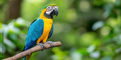 blue and yellow macaw sitting on a branch with blur forest background