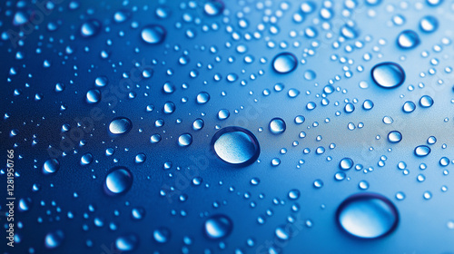 blue background of close-up view of water droplets on a smooth surface, creating a visually striking pattern.
