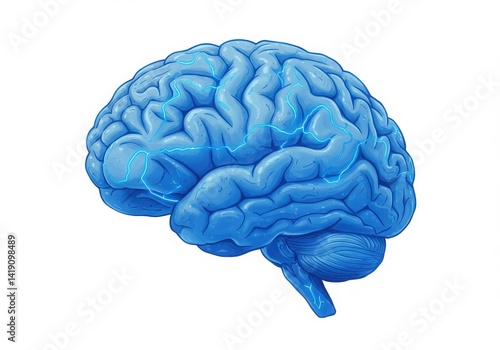 Blue brain with lightning illustration on white background