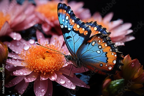 blue butterfly drinking dew water on a pink flower