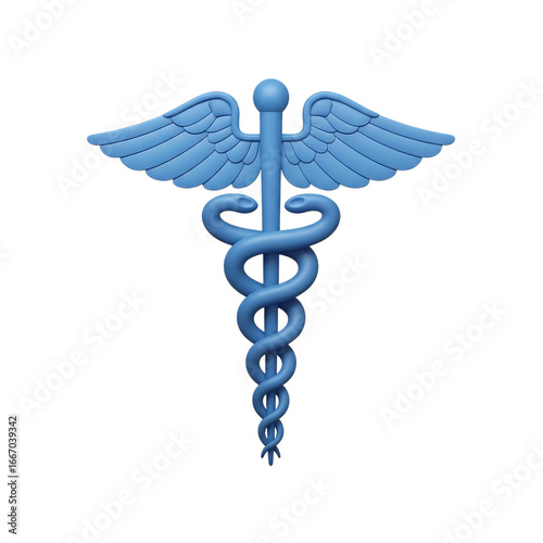 Blue caduceus medical symbol with wings isolated on transparent background