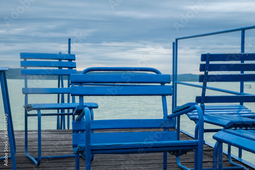 blue chairs on dock or pier waiting for turist - cloudy sky cold weather at Balaton lake in the summer season