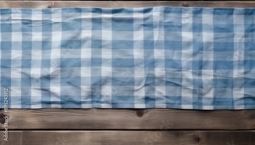 blue check tablecloth on wooden table