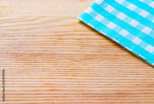 Blue checkered tablecloth on a light wooden background.