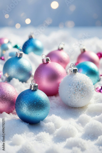 blue Christmas balls on snow