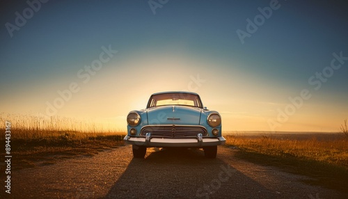 blue classic car facing the camera, minimalist, deadpan, banal, cool, clinical, urban, iconic, conceptual, subversive, sparse, restrained, symbol