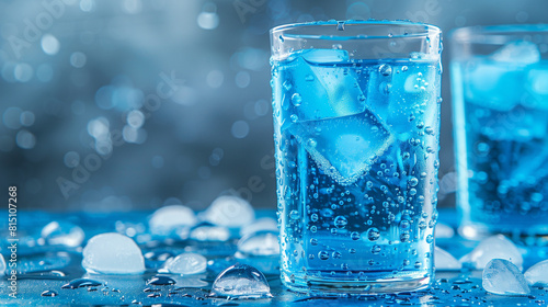 Blue cocktail close up with ice cubes and water drops