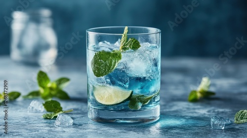 Blue cocktail, mint, ice, lime, drink, studio, refreshment, summer