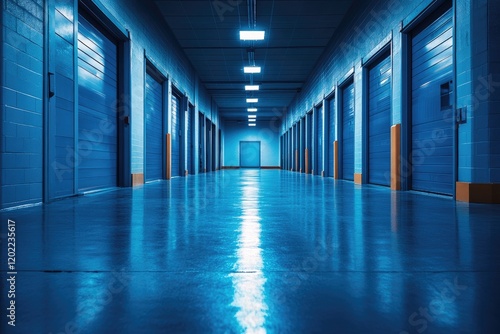blue, corridor, door, storage, long, row, hallway, warehouse, industrial, unit, garage, facility, building, interior, architecture, design, space, empty, dark, light, light, ceiling, floor, reflective, shiny, wall, metal, concrete, perspective, depth, line, pattern, texture, cold, modern, minimalist, stark, quiet, stillness, calm, serene, night, shadow