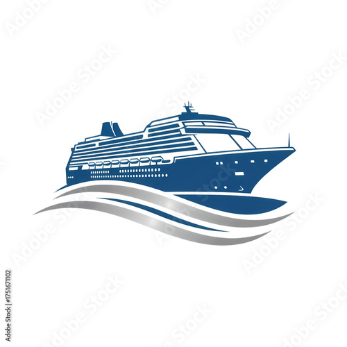 cruise ship, ocean liner, ship, boat, travel, journey, voyage, sea, ocean, water, wave, maritime, navigation, transport, vacation, holiday, tour tourism, emblem, logotype, icon, symbol, graphic, illustration, blue, silver, white background, simple, design, luxury, recreation, sailing, marin, nautical, adventure, destination, explore, trip, summer, leisure, abroad, port, deck