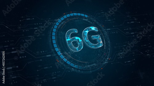 Blue digital 6G letter and circle futuristic HUD elements with flowing arrows with generation of connection technology concepts on abstract background