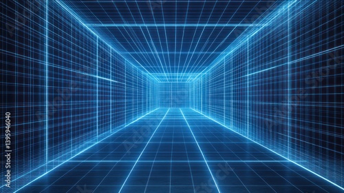 Blue digital grid tunnel, receding perspective, dark background, virtual reality